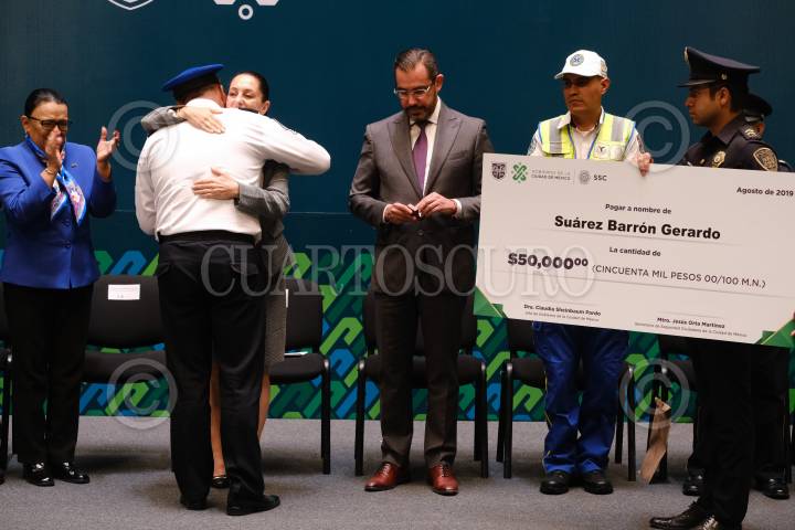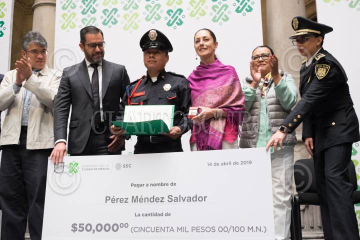 CIUDAD DE MÉXICO, 02SEPTIEMBRE2019.- Rosa Icela Rodríguez, secretaria de Gobierno; Claudia Sheinbaum, jefa de Gobierno, y Jesús Orta Martínez, secretario de Seguridad Ciudadana, entregaron un cheque por un monto de cincuenta mil pesos a Gerardo Suárez Barrón por recibir el reconocimiento del Policía del Mes Escuadrón de Rescate y Urgencias Médicas (ERUM) y condecoraciones 2019, el cual se realizó en el Antiguo Palacio del Ayuntamiento. FOTO: GRACIELA LÓPEZ /CUARTOSCURO.COM