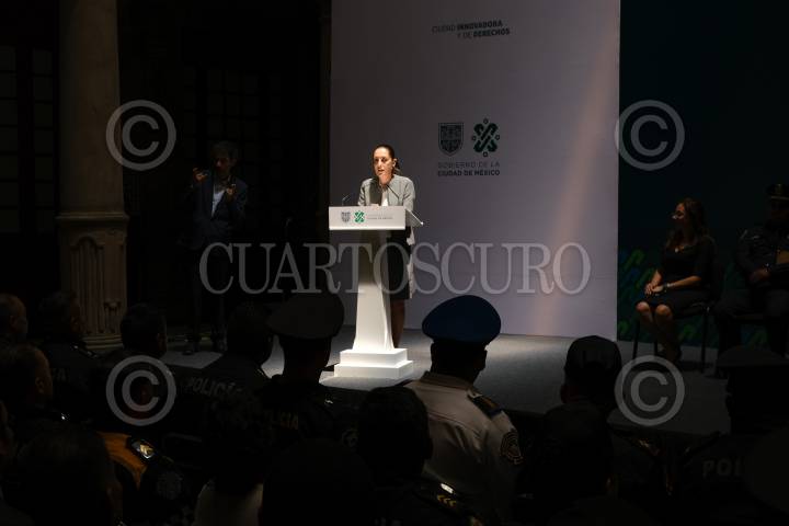 CIUDAD DE MÉXICO, 02SEPTIEMBRE2019.- Claudia Sheinbaum, jefa de Gobierno, durante la ceremonia del Policía del Mes Escuadrón de Rescate y Urgencias Médicas (ERUM) y condecoraciones 2019, el cual se realizó en el Antiguo Palacio del Ayuntamiento. FOTO: GRACIELA LÓPEZ /CUARTOSCURO.COM