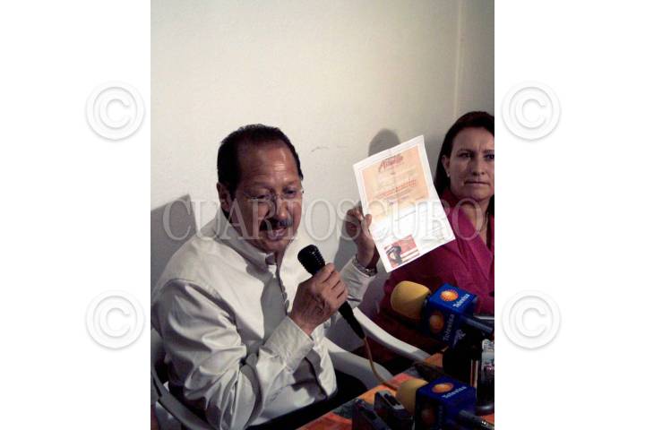 CHILPANCINGO, GUERRERO, 04FEBRERO2005.- El dirigente nacional del PRD, Leonel Godoy y la senadora Leticia Burgos durante la conferencia de prensa donde informaron sobre las denuncias por delitos electorales que interpondran en la Fepade local, Fepade federal y PGJE en contra de Hector Astudillo Flores, candidato de la coalicion "Todos por Guerrero" al gobierno del estado y a Hector Vicario Castrejon, dirigente estatal del PRI por la reparticion de polizas de seguro contra accidentes y despensas con propaganda a favor de Astudillo Flores. FOTO: Oscar Alvarado/CUARTOSCURO.COM