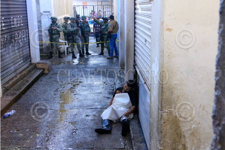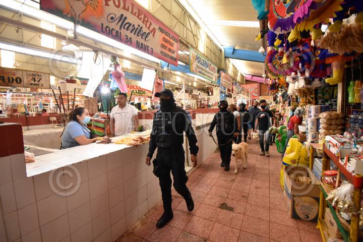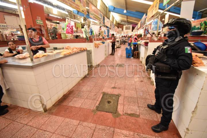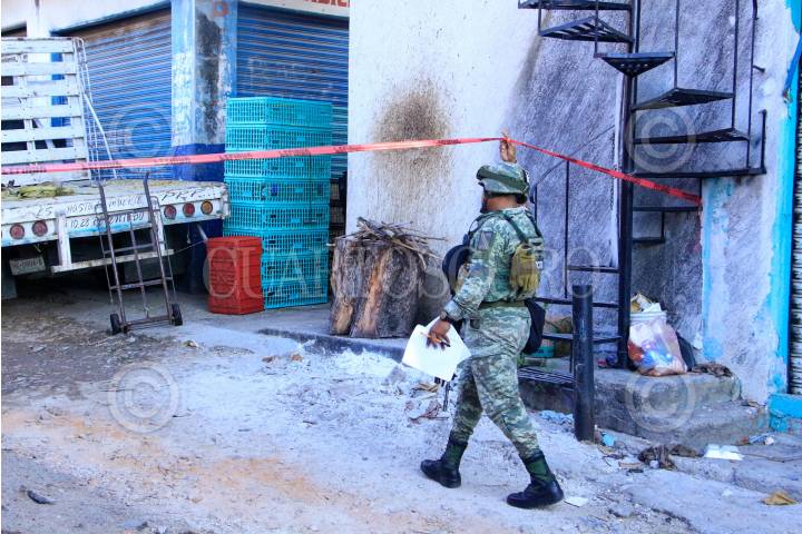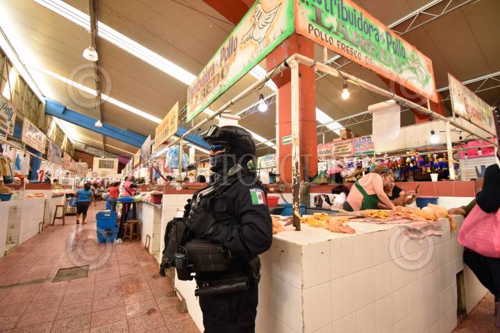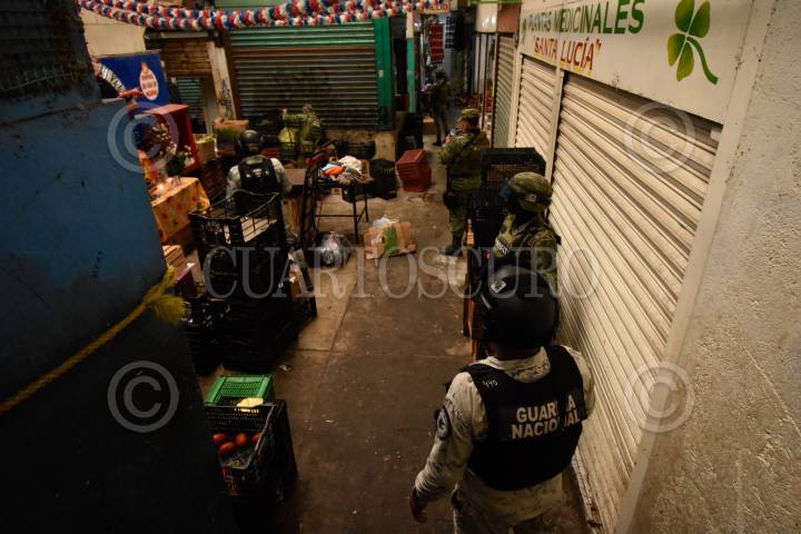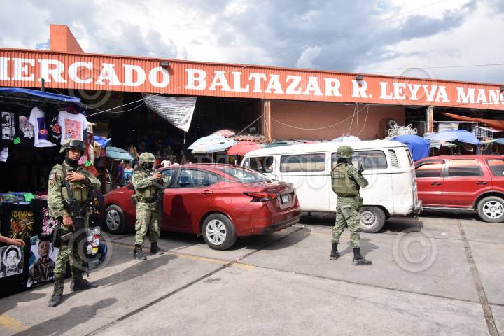 Soldados vigilan el mercado Baltazar R. Leyva Mancilla tras el asesinato de 8 comerciantes relacionados con la venta de pollo en Chilpancingo.