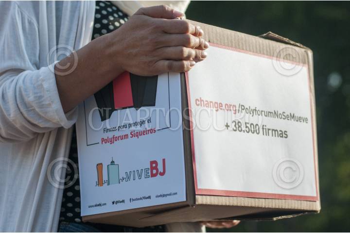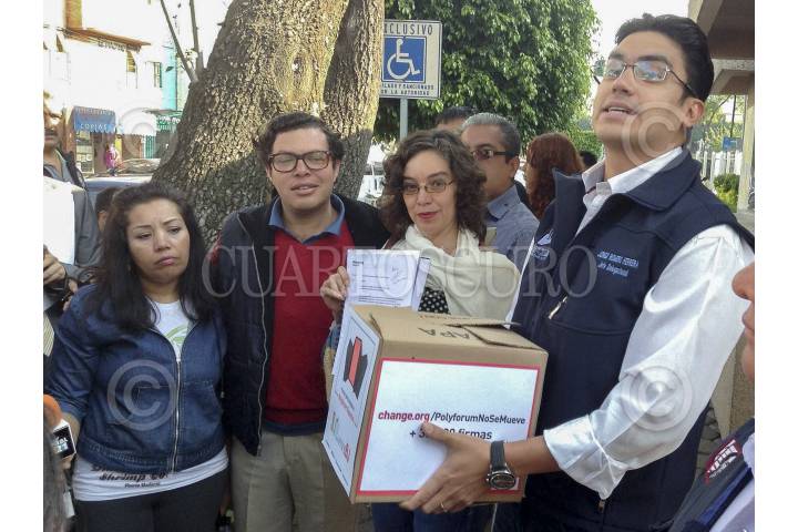 MÉXICO, D.F., 21MAYO2014.- Vecinos de la delegación Benito Juárez y de la organización ViveBJ, acudieron a la explanada de dicha demarcación para entregar un paquete con más de 38 mil firmas en apoyo a la protección del Polyforum Siqueiros que fueron recibidas por el jefe delegacional Jorge Romero Herrera, quien volvió a aclarar a los vecinos que dicho edificio no será destruido o desplazado y que se buscaran apoyos de diversas instituciones para que el Polyforum tenga un justo mantenimiento. FOTO: DIEGO SIMÓN SÁNCHEZ /CUARTOSCURO.COM