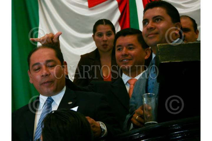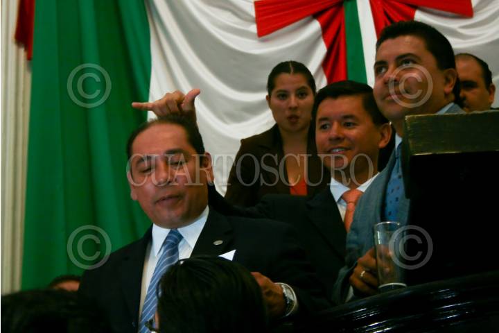 MÉXICO D.F., 22ABRIL2008.- El Diputado panista Alfredo Vinalay Pone cuernos al Diputado del sol azteca Miguel Sorsatan, durante la toma de tribuna en la Asamblea Legislativa. FOTO: SÁSHENKA GUTIERREZ/CUARTOSCURO.COM