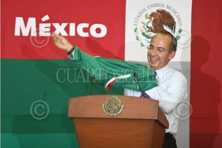 MÉXICO, D.F., 09JUNIO2008.- Felipe Calderon Presidente de México se pone la Playera que usara la delegación Mexicana durante los juegos olimpicos de Beijing 2008 FOTO: SÁSHENKA GUTIÉRREZ/CUARTOSCURO.COM