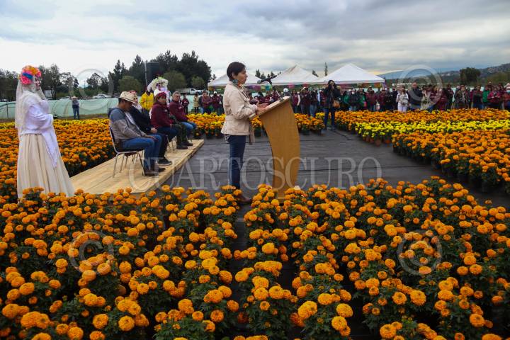 Ejido San Gregorio, en Xochimilco se encuentra el centro de producción de flores de cempazuchitl Altepetl. Marina Robles encabezó el inicio de venta de estas flores.