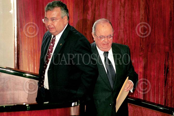 México, D.F. 01 AGOSTO 2004.- Los magistrados Eloy Fuentes Cerda y José Fernando Martínez Porcayo, presidente del TRIFE antes de iniciar la sesión pública donde se rebocaron la demanda emitida por la coalición Todos somos Oaxaca, y dispusieron apoyar al tribunal oaxaqueño en posobles sanciones si se comete alguna violación a las leyes impuestas por el Estado. FOTO: Sandra Perdomo/CUARTOSCURO.COM