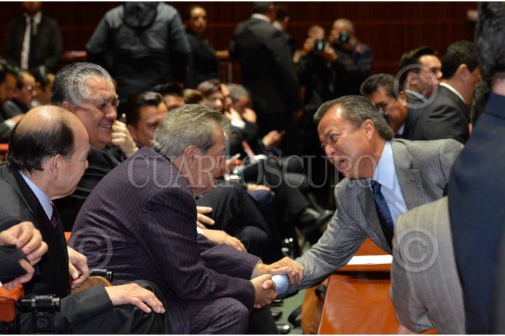 MÉXICO, D.F., 20ENERO2016.- Miguel Ángel Mancera, asistió la mañana de hoy a la sesión de la Comisión Permanente del Congreso, para la declaratoria de constitucionalidad de la reforma política de la Ciudad de México. En la imagen Porfirio Muñoz Ledo saluda a César Camacho Quiroz, coordinador de los diputados del PRI. FOTO: CUARTOSCURO.COM