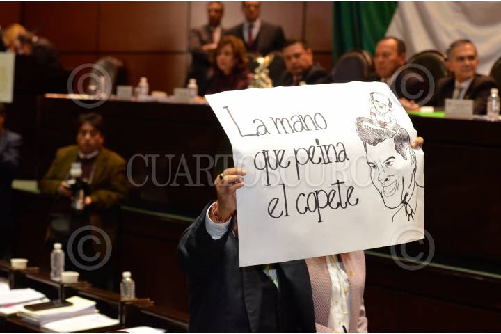 MÉXICO, D.F., 20ENERO2016.- Miguel Ángel Mancera, asistió la mañana de hoy a la sesión de la Comisión Permanente del Congreso, para la declaratoria de constitucionalidad de la reforma política de la Ciudad de México. En la imagen, un legislador de Morena muestra una pancarta critica al jefe de gobierno. FOTO: CUARTOSCURO.COM