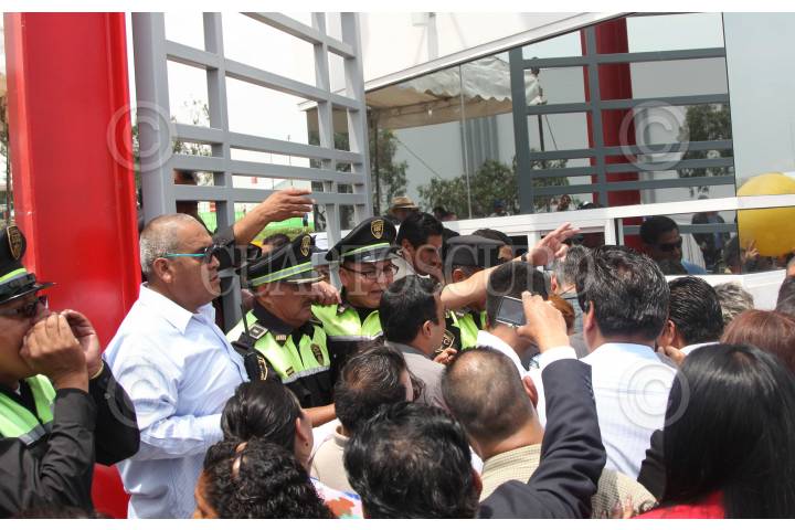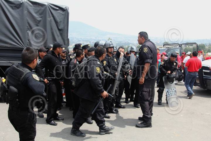 LOS REYES LA PAZ, 24JULIO2014.- Habitantes de los Reyes la Paz intentaron dar portazo durante la inauguración del mega proyecto deportivo Soraya Jiménez, Plaza Estado de México, después que elementos de seguridad y personal de logística les negaron el acceso. Granaderos del Edomex asistieron al lugar para para resguardar los acceso al deportivo. FOTO: SAUL LOPEZ /CUARTOSCURO.COM