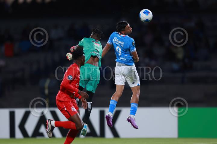 CIUDAD DE MÉXICO, 11FEBRERO2025. El delantero de la Máquina, Ángel Sepúlveda cabecea tras la salida del portero Gooly Elien de conjunto haitiano y conseguir una anotación durante el partido de fútbol Cruz Azul (MEX) vs Real Hope (HAI) correspondiente a la vuelta de la primera ronda en la Copa de Campeones Concacaf, disputado en el Estadio Olímpico Universitario. FOTO: EDGAR NEGRETE LIRA/CUARTOSCURO.COM