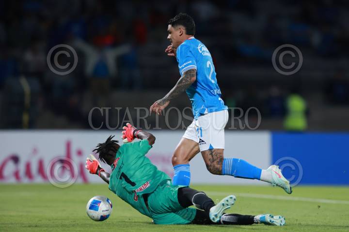 CIUDAD DE MÉXICO, 11FEBRERO2025. Gabriel Fernández se lleva al portero Gooly Elien con lo que logra marcar un gol durante el partido de fútbol Cruz Azul (MEX) vs Real Hope (HAI) correspondiente a la vuelta de la primera ronda en la Copa de Campeones Concacaf, disputado en el Estadio Olímpico Universitario. FOTO: EDGAR NEGRETE LIRA/CUARTOSCURO.COM