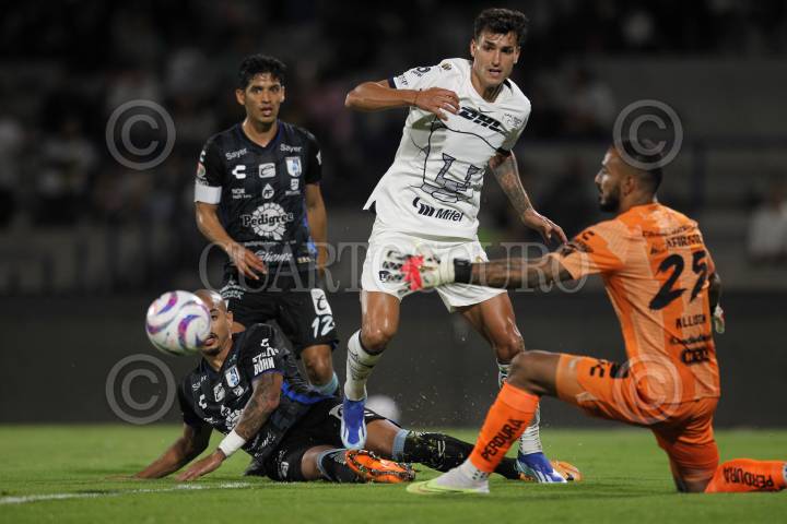 CIUDAD DE MÉXICO, 04AGOSTO2023. Juan Dinenno de Pumas en una jugada entre Jaime Gómez, Emanuel Gularte y el portero Guillermo Allison de Gallos Blancos durante el partido de fútbol Pumas vs Querétaro correspondiente a la jornada 11 del Torneo Apertura 2023 de Liga BBVA MX, en el Estadio Olímpico Universitario. FOTO: EDGAR NEGRETE/CUARTOSCURO.COM
