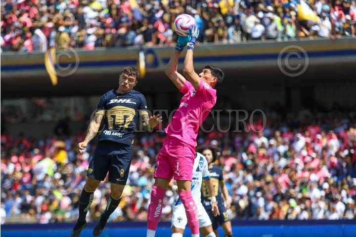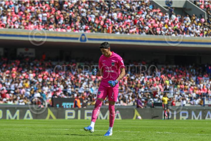 CIUDAD DE MÉXICO, 22OCTUBRE2023.-Esteban Andrada, portero del Monterrey, celebra la única anotación de su equipo y que les valió la victoria ante los Pumas, en el Estadio Olímpico Universitario. FOTO: MOISÉS PABLO/CUARTOSCURO.COM
