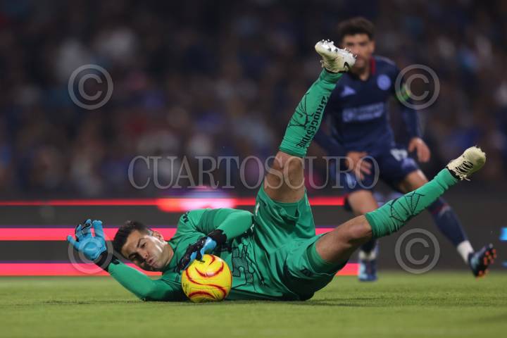 CIUDAD DE MÉXICO, 06JULIO2024. El portero Hugo González detiene un tiro del jugador de la Máquina Celeste, Uriel Antuna durante el partido de fútbol Cruz Azul vs Mazatlán FC correspondiente a la jornada 1 del Torneo Apertura 2024 de Liga BBVA MX, en el Estadio Ciudad de los Deportes. FOTO: EDGAR NEGRETE LIRA/CUARTOSCURO.COM