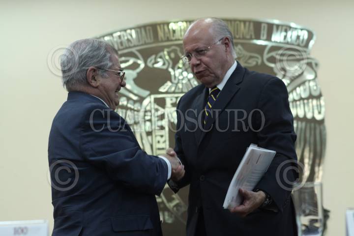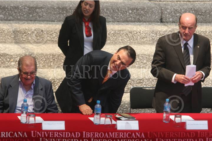 MÉXICO, D.F., 10SEPTIEMBRE2010.- Miguel León Portilla, historiador de la UNAM y José Narro Robles, rector de la Universidad Nacional Autónoma de México, encabezaron una ceremonia conmemorativa del Bicentenario, en el auditorio Maestro Carlos Pérez del Toro, Facultad de Economía. FOTO: MOISÉS PABLO/CUARTOSCURO.COM