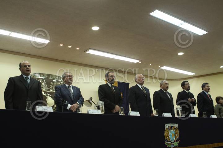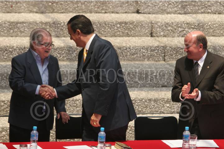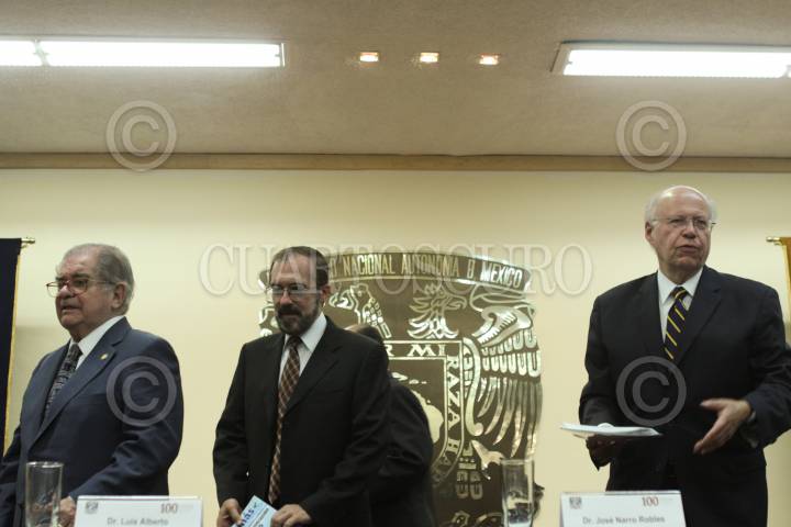 MÉXICO, D.F., 10SEPTIEMBRE2010.- Miguel León Portilla, historiador de la UNAM, Luis Alberto Zarco Quintero y José Narro Robles, rector de la Universidad Nacional Autónoma de México, encabezaron una ceremonia conmemorativa del Bicentenario, en el auditorio Maestro Carlos Pérez del Toro, Facultad de Economía. FOTO: MOISÉS PABLO/CUARTOSCURO.COM