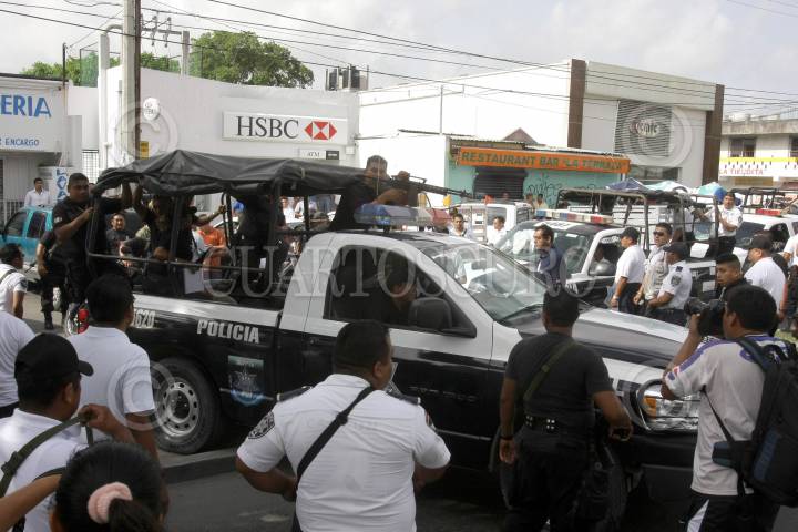 CANCUN, QUINTANA ROO, 14JULIO2010.- Cinco hombres armados intentaron asaltar esta mañana, la sucursal del banco HSBC ubicada en la avenida López Portillo, frente a la Megacomercial. Los asaltantes aprovecharon el momento en que el personal abría las puertas del banco para ingresar con violencia y someter al personal del seguridad, a los empleados y a los pocos clientes que a esa hora estaban en el lugar. Según los primeros reportes, los hombres portaban armas largas y bajo amenazas despojaron a los presentes de sus pertenencias de valor. FOTO: AMARANTA PRIETO/CUARTOSCURO.COM