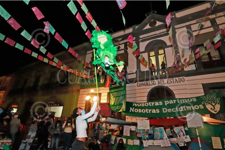 Mujeres golpean una piñata afuera del Congreso poblano.