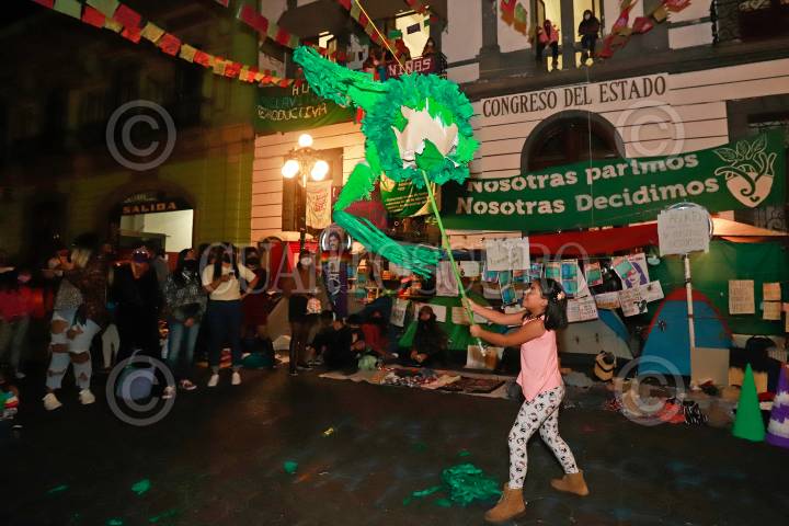Una niña golpea la piñata durante la posada feminista afuera del Congreso de Puebla.