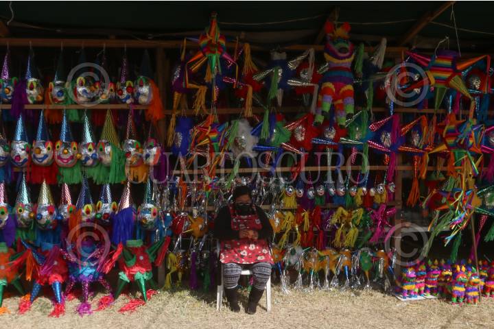 Una comerciante vende piñatas en la Romería Navideña de la Central de Abastos