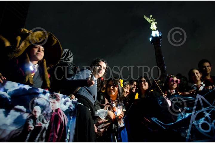 MÉXICO, D.F., 15JULIO2011.- Decenas de fans de la película Harry Potter realizaron una caminata sobre la avenida Paseo de la Reforma, de reforma 222 a la glorieta del Ángel de la Independencia debido al final de la saga de magia y ciencia ficción que marco toda una generación. La mayoría de los jóvenes acudieron disfrazados de magos y sobre la banqueta formaron un rayo en alusión a la película. FOTO: DIEGO SIMÓN SÁNCHEZ/CUARTOSCURO.COM