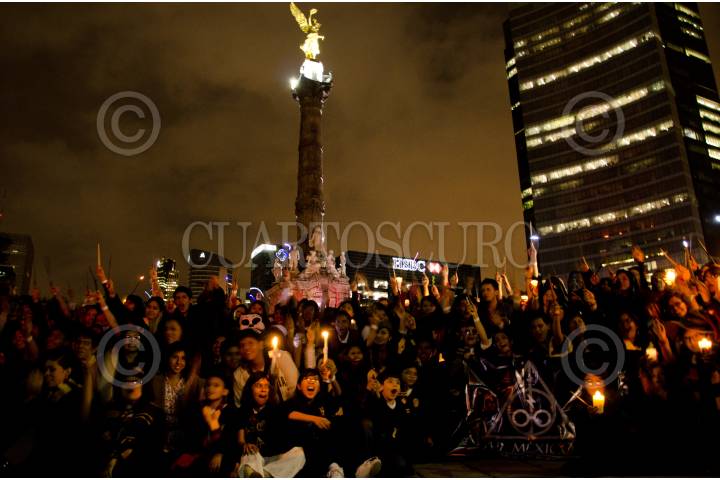 MÉXICO, D.F., 15JULIO2011.- Cientos de niños jóvenes y adultos, se dieron cita en el Centro Comercial Reforma 222 para realizar una caminata silenciosa al Ángel de la Independencia por el estreno y final de la saga de la película Harry Potter. FOTOS: MISAEL VALTIERRA/CUARTOSCURO.COM