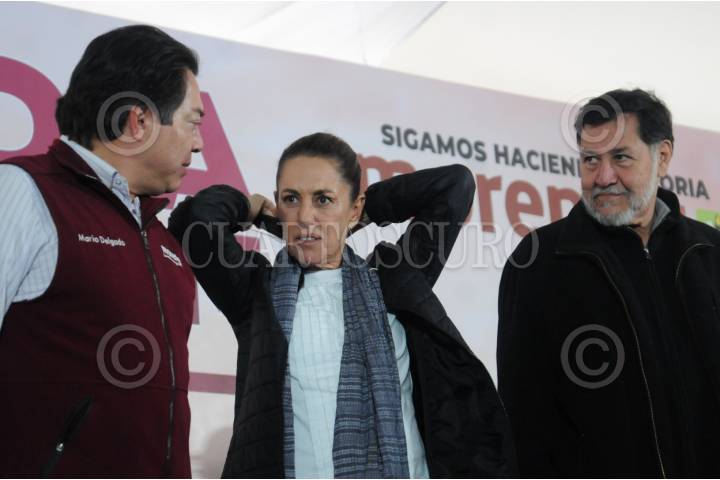 HUIXQUILUCAN, EDOMEX, 07ENERO2024. - Claudia Sheinbaum fue acompañada por el dirigente de Morena, Mario Delgado y su vocero, Gerardo Fernández Noñora. FOTO: DANIEL AUGUSTO /CUARTOSCURO.COM