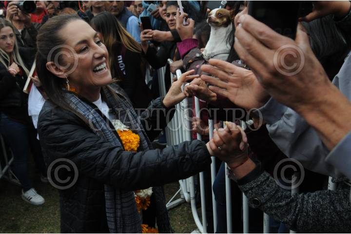 HUIXQUILUCAN, EDOMEX, 07ENERO2024. - Claudia Sheinbaum, precandidata única de Morena a la presidencia de la República, saluda a sus seguidores en el Estado de México, lugar donde realizó uno de sus mítines este domingo. FOTO: DANIEL AUGUSTO /CUARTOSCURO.COM