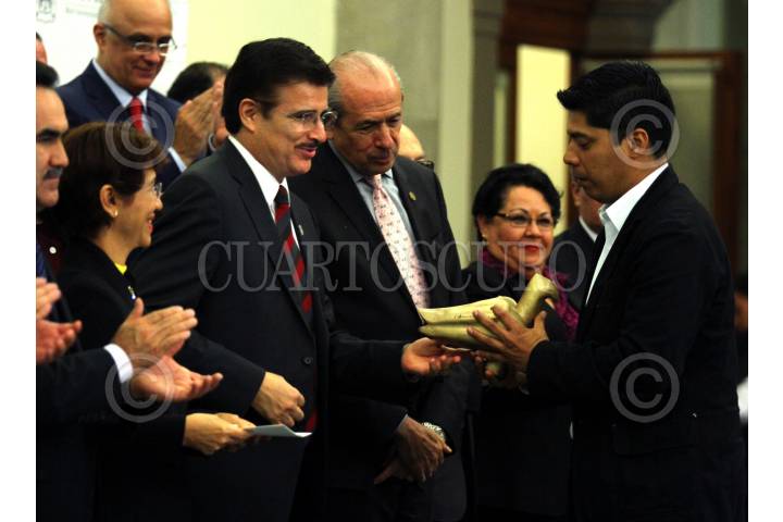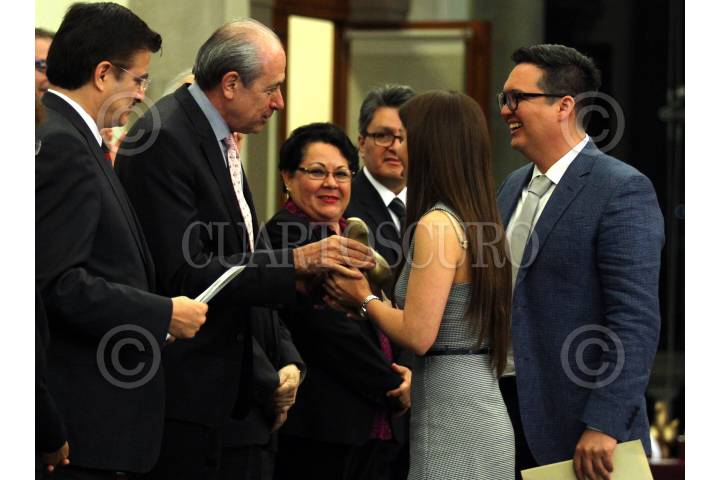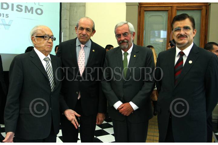 CIUDAD DE MÉXICO, 14OCTUBRE2016.- Esta noche, el Comité Ciudadano del Premio Nacional de Periodismo (PNP) galardonó a los mejores trabajos periodísticos en las categorías de Reportaje, Crónica, Fotografía, Caricatura, Científico, Entrevista y Trayectoria. La ceremonia se llevó a cabo en el Museo del Castillo de Chapultepec. En la foto, Luis Javier Solana Morales, asociado fundador del PNP; Enrique Fernández Fassnacht, rector del Instituto Politécnico Nacional (IPN), Enrique Luis Graue Wiechers, Rector de la Universidad Nacional Autónoma de México; Itzcóatl Tonatiuh Bravo Padilla, Rector de la Universidad de Guadalajara y presidente del Consejo Ciudadano del PNP. FOTO: ADOLFO VLADIMIR /CUARTOSCURO.COM