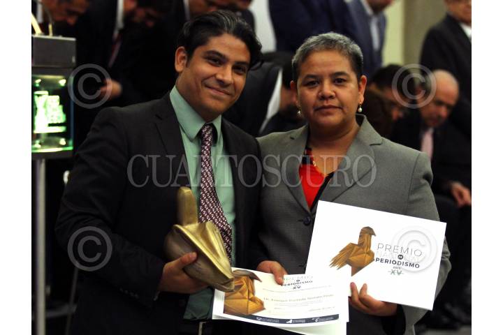 CIUDAD DE MÉXICO, 14OCTUBRE2016.- Esta noche, el Comité Ciudadano del Premio Nacional de Periodismo (PNP) galardonó a los mejores trabajos periodísticos en las categorías de Reportaje, Crónica, Fotografía, Caricatura, Científico, Entrevista y Trayectoria. La ceremonia se llevó a cabo en el Museo del Castillo de Chapultepec. En la foto, Silver Meza y Zorayda Gallegos, periodistas ganadores en la categoría de noticia por su Cobertura del "Expediente Ayotzinapa", publicado en El Universal. FOTO: ADOLFO VLADIMIR /CUARTOSCURO.COM