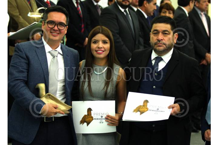 CIUDAD DE MÉXICO, 14OCTUBRE2016.- Esta noche, el Comité Ciudadano del Premio Nacional de Periodismo (PNP) galardonó a los mejores trabajos periodísticos en las categorías de Reportaje, Crónica, Fotografía, Caricatura, Científico, Entrevista y Trayectoria. La ceremonia se llevó a cabo en el Museo del Castillo de Chapultepec. En la foto, Silver Meza y Zorayda Gallegos, periodistas ganadores, acompañados por Francisco Santiago, director de El Universal, medio en el cual fue publicado el reportaje. FOTO: ADOLFO VLADIMIR /CUARTOSCURO.COM