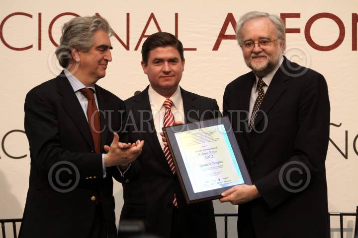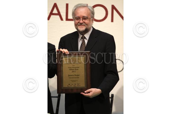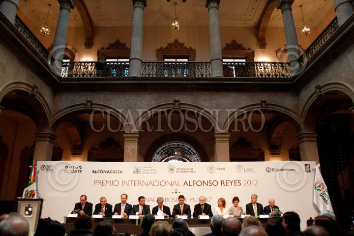 MONTERREY, NUEVO LEÓN, 13MARZO2013.- El premio internacional Alfonso Reyes 2012 fue otorgado al filósofo y lingüista español Ignacio Bosque Muñoz en manos del gobernador del estado Rodrigo Medina. El reconocimiento fue creado en1972 siendo Jorge Luis Borges el primero en recibirlo, también Octavio Paz en 1985, entre otros. En la entrega estuvieron presentes los rectores de las principales universidades de Nuevo León, así como autoridades de cultura en la entidad. FOTO: GABRIELA PÉREZ MONTIEL / CUARTOSCURO.COM