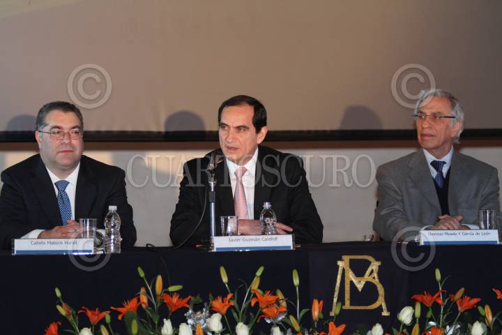 MÉXICO, D.F., 27NOVIEMBRE2013.- Calixto Mateos Hanel, director de Vinculación Institucional del Banco de México, Javier Eduardo Guzmán Calafell, subgobernador del Banco de México y Dionisio Meade y García de León, director general de Relaciones Institucionales del BM, durante la ceremonia de entrega a las escuelas seleccionadas y ganadoras del Premio Contacto Banxico 2013. FOTO: ADOLFO VLADIMIR /CUARTOSCURO.COM