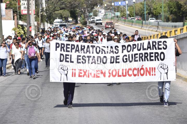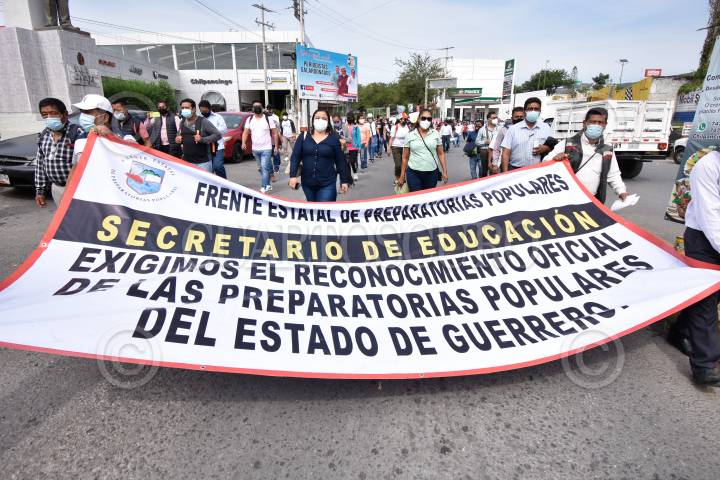 Profesores de preparatorias populares marcharon en Chilpancingo para exigir el pago de salarios para más de mil 200 docentes y el reconocimiento oficial de los 135 planteles ubicados en todo el estado de Guerrero.