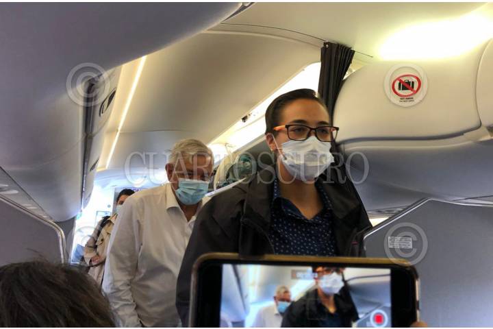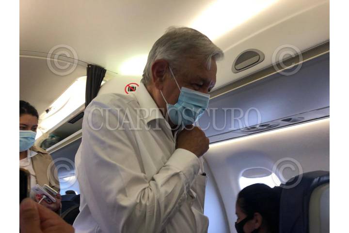 El Jefe del Ejecutivo Andrés Manuel López Obrador usa cubrebocas al abordar su vuelo de regreso hacia la Ciudad de México.