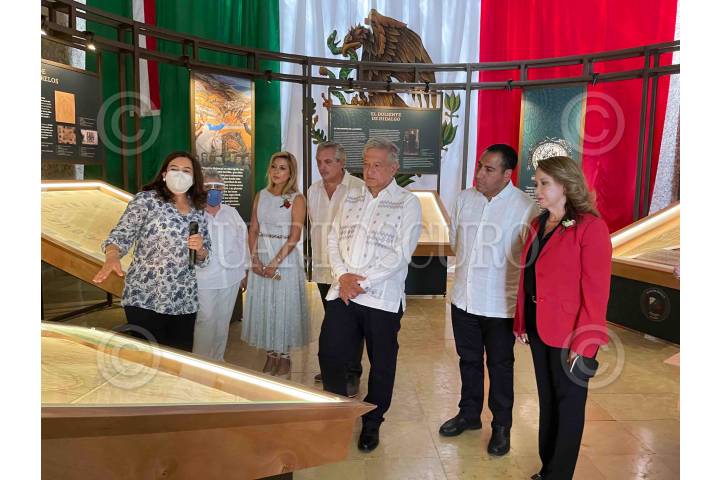 Fabiola Andrea Yáñez, esposa del mandatario argentino; Alberto Fernández, Presidente de Argentina; Andrés Manuel López Obrador, Presidente de México; Eduardo Ramírez Aguilar, presidente del Senado, y Yasmín Esquivel Mossa, ministra de la SCJN, recorrieron la exposición la "Ruta de Banderas Históricas".