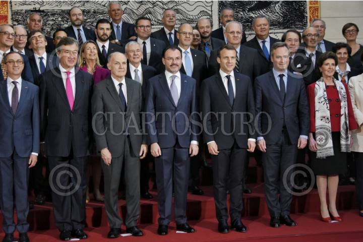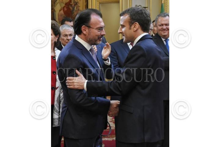 PARÍS, FRANCIA, 16ABRIL2018.- En su primer día de trabajo en París, el Secretario de Relaciones Exteriores, Luis Videgaray, sostuvo un encuentro con el Presidente de Francia, Emmanuel Macron, con quien coincidió en pronunciarse a favor de una relación bilateral que trascienda coyunturas y en refrendar los lazos que unen a México y esa nación. En el Palacio del Elíseo, el Canciller Videgaray y el mandatario francés reafirmaron su compromiso por impulsar proyectos que apuntalen la alianza binacional y recibieron a los integrantes del Consejo Estratégico Franco-Mexicano (CEFM), que plantea propuestas y acciones para fortalecer la vinculación bilateral. FOTO: SRE /CUARTOSCURO.COM