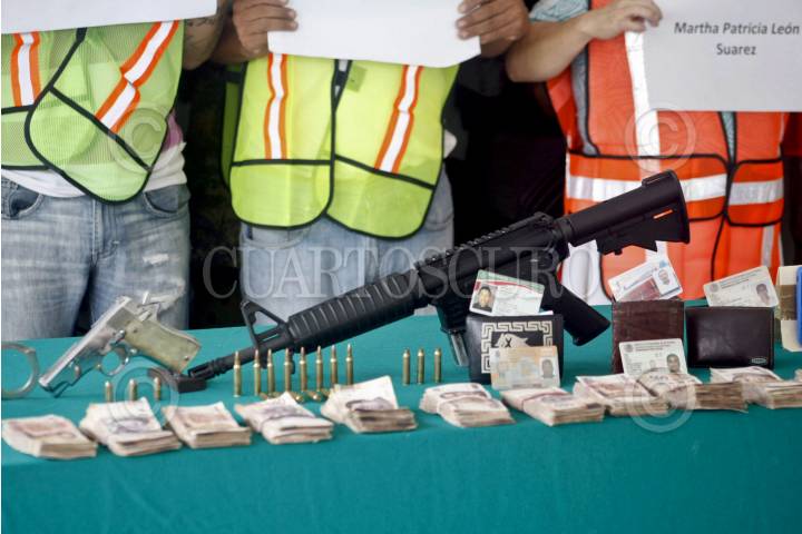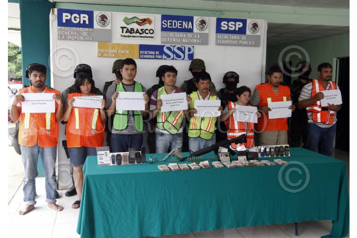 VILLAHERMOSA, TABASCO, 07AGOSTO2012.- Elementos del ejército presentaron, en las instalaciones de la Policía Ministerial, una presunta banda de plagiarios y asaltantes conformada por seis hombres y dos mujeres y que según las autoridades operaban en Chiapas y Tabasco. Les decomisaron vehículos, armas, teléfonos celulares y dinero en efectivo. FOTO: MARCO POLO GUZMÁN HERNÁNDEZ/CUARTOSCURO.COM