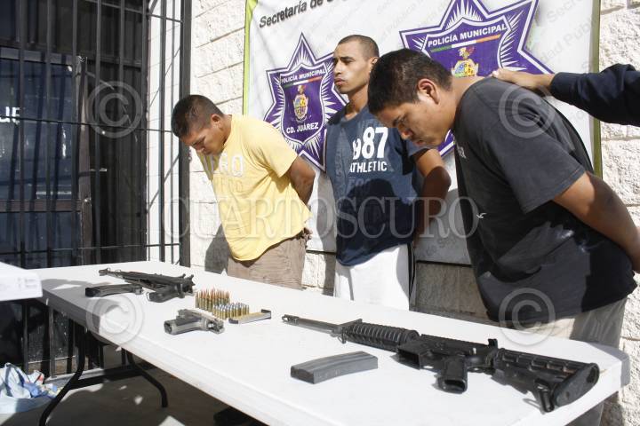 CIUDAD JUÁREZ, CHIHUAHUA, 11JULIO2013.- Policías municipales detuvieron en la colonia Bellavista a tres hombres a quienes se les acusa de ataque contra agentes de la corporación ayer en la Posada Pompa. Según informó el vocero de la Secretaría de Seguridad Pública Municipal, Adrián Sánchez, que los tres hombres que se les acusa del ataque contra el agente responden al nombre de Édgar Raúl Ramos Rico de 23, José Andrés Bustamante de 27 y José Lucio Hernández de 29 años de edad. Se les aseguró arma de fuego 7.42x39, otra .223 con cinco cartuchos y arma tipo escuadra .45. FOTO: NACHO RUIZ /CUARTOSCURO.COM