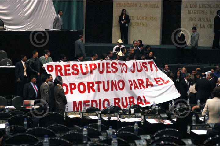 MÉXICO D.F. 21DICIEMBRE2006.- Diputados de las diferentes fracciónes muestran una manta con la leyenda "Presupueto Justo y Oportuno al Campo" durante sesion en la cámara de diputados. FOTO: GUILLERMO PEREA/CUARTOSCURO.COM