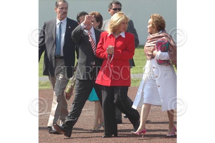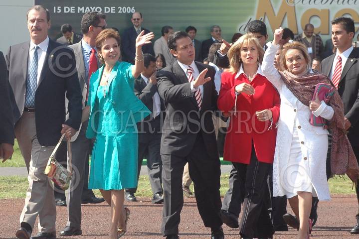 METEPEC, ESTADO DE MÉXICO, 15MAYO2006.- Vicente Fox Quesada, primer mandatario mexicano, Marta Sahagún de Fox, Enrique Peña Nieto, gobernador del Estado, Mónica Pretelini, esposa del gobernador del Estado y Elba Esther Gordillo Morales, líder del Sindicato Nacional de Trabajadores de la Educación (SNTE) y durante la ceremonia conmemorativa del día del maestro realizada en el Centro Cultural Mexiquense. FOTO: Iván Stephens/CUARTOSCURO.COM