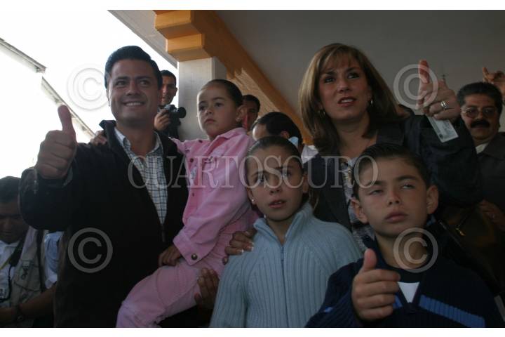 MÉXICO D.F. 11ENERO2007.- Mónica Pretelini Saenz, esposa del gobernador Enrique Peña Nieto fallecio en un hostipal capitalino. En imagen del 3de julio del 2005, Enrique Peña Nieto, candidato de la Alianza por México a la gubernatura del Estado de México, acompañado de su esposa Mónica Pretelini e hijos al termino de emitir su voto. FOTO: NELLY SALAS/CUARTOSCURO.COM