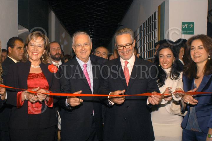MÉXICO, D.F. 08SEPTIEMBRE2006.- Ana Teresa Aranda, Secretaria de Desarrollo Social; Hugo Salinas Price; Ricardo Salinas Pliego, Presidente de Grupo Salinas; su esposa, María Laura Medina de Salinas y Mercedes García Ocejo, Directora de Fomento Cultural Grupo Salinas, durante el corte del listón inaugural de la exposición del "Tercer Premio de la Plata Hugo Salinas Price". FOTO: TV AZTECA/CUARTOSCURO.COM