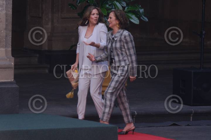 Beatriz Gutiérrez Müller, esposa de Andrés Manuel López Obrador, presidente de México, y Sophie Grégorie, esposa de Justin Pierre James Trudeau, primer ministro de Canadá, durante la ceremonia de bienvenida en Palacio Nacional.