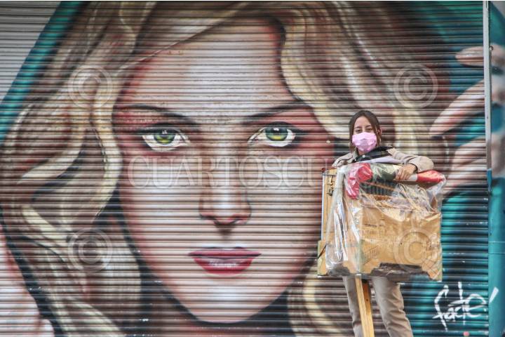 Dos mujeres caminan frente a local cerrado donde se realizan vestimenta para Niños Dios.