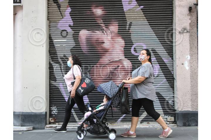 Dos mujeres con una niña en carriola, pasan frente a mural alusivo a la mujer en el Centro Histórico. FOTO: ROGELIO MORALES /CUARTOSCURO.COM