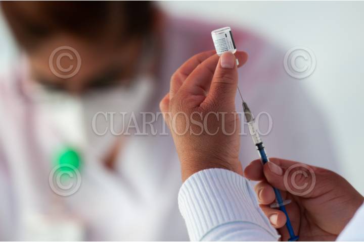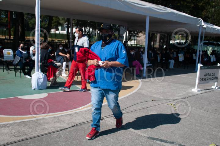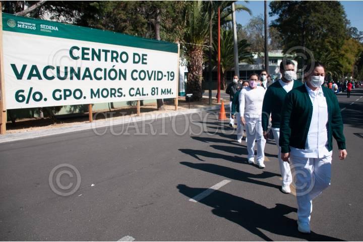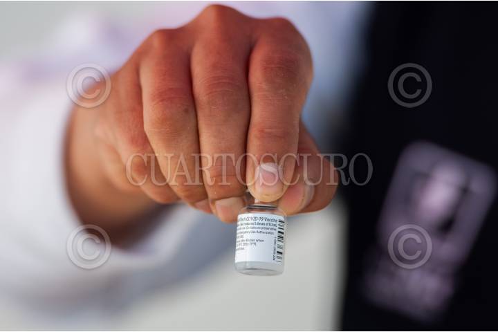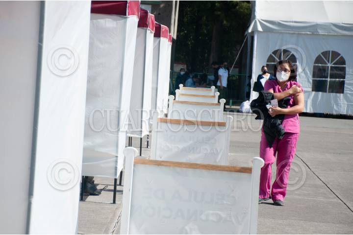 Aplicación de la vacuna de Pfizer contra Covid-19en una de las Células de Vacunación instalados por la SEDENA.