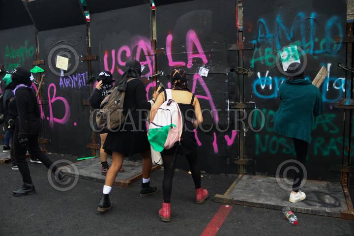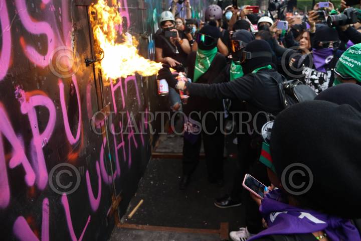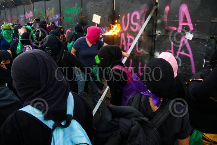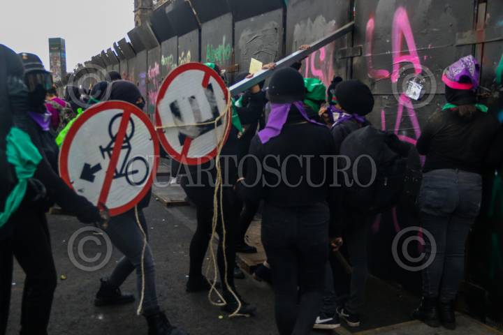 Diversos colectivos Feministas pretendieron derribar las vallas que protegen Palacio Nacional, está tarde al concluir la marcha Pro Aborto.