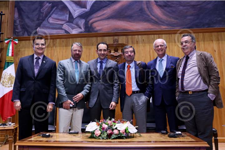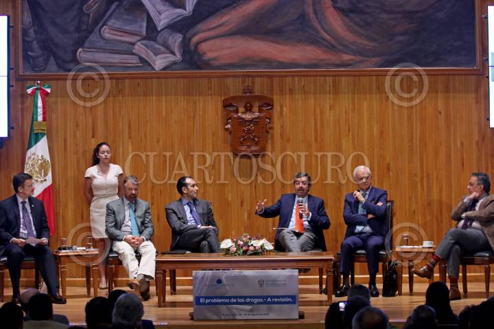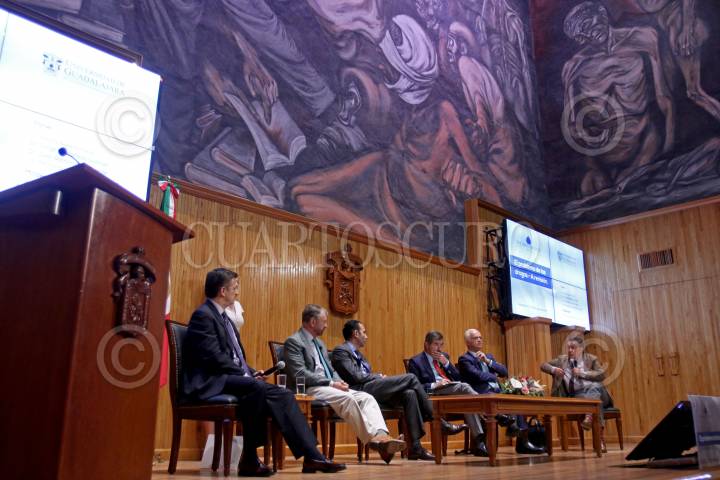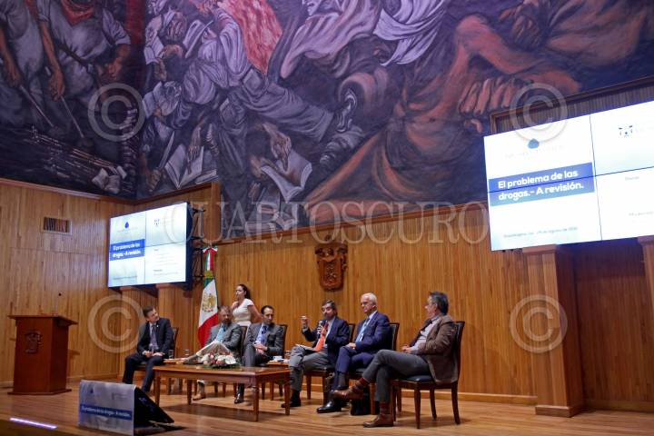 GUADALAJARA, JALISCO, 25AGOSTO2016.- Roberto Gil Zuarth, Presidente del Senado de la Republica, Juan Ramón de la Fuente, ex Secretario de Salud, Pedro Aspe, ex Secretario de Hacienda y Crédito Publico y Fernando Gómez Mont Urueta, ex Secretario de Gobernación encabezaron el panel denominado, El Problema de las Drogas. – A Revisión. Mismo que fue moderado por el Rector de la Universidad de Guadalajara, Tonatiuh Bravo Padilla, dicho evento se llevo a cabo en el Paraninfo Enrique Díaz de León de ya mencionada universidad y fue organizado por la U. De G. y The Aspen Institute. FOTO : FERNANDO CARRANZA GARCIA / CUARTOSCURO.COM