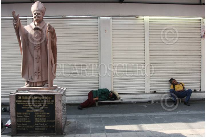 Dos hombres en aparente estado de ebriedad, duermen a las espaldas de una estatua del Papa Juan Pablo II en la Calle Niño Dios de la colonia Centro.
