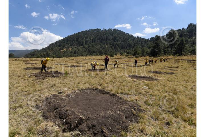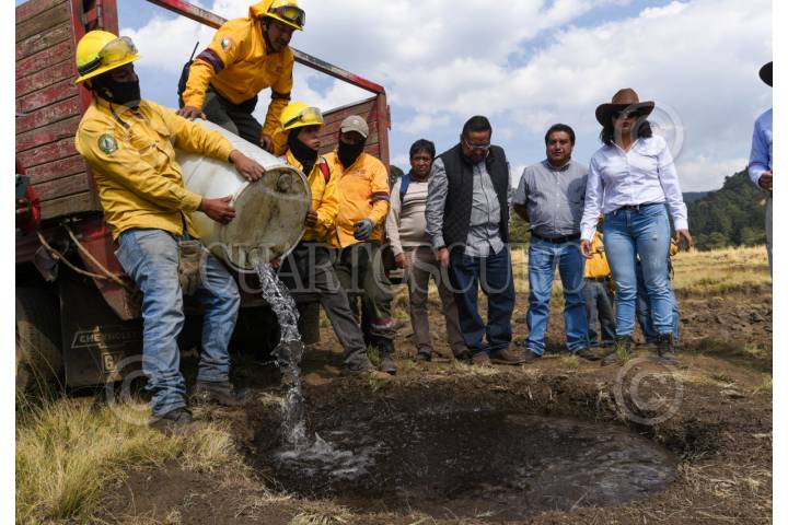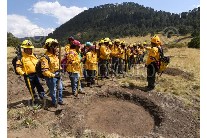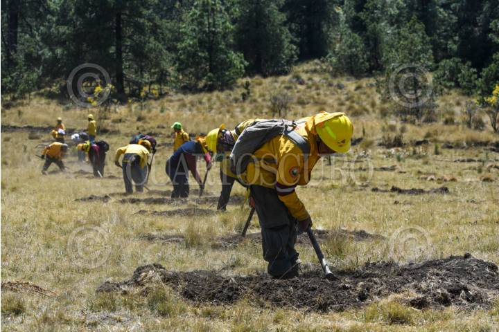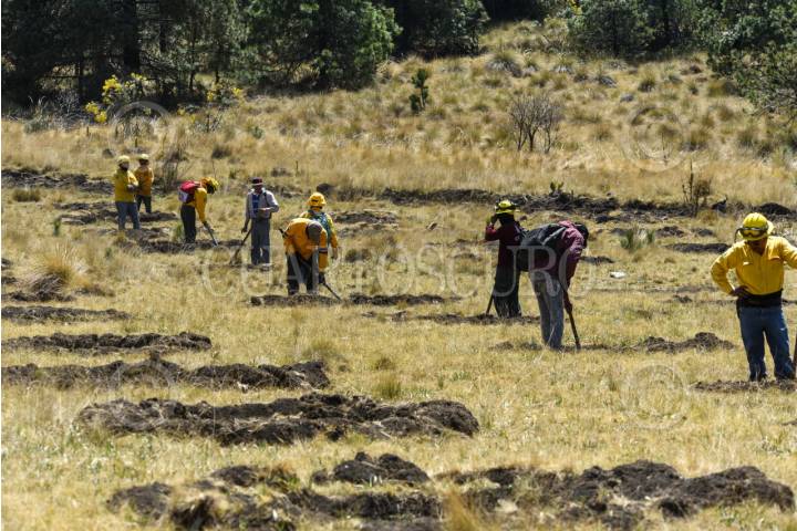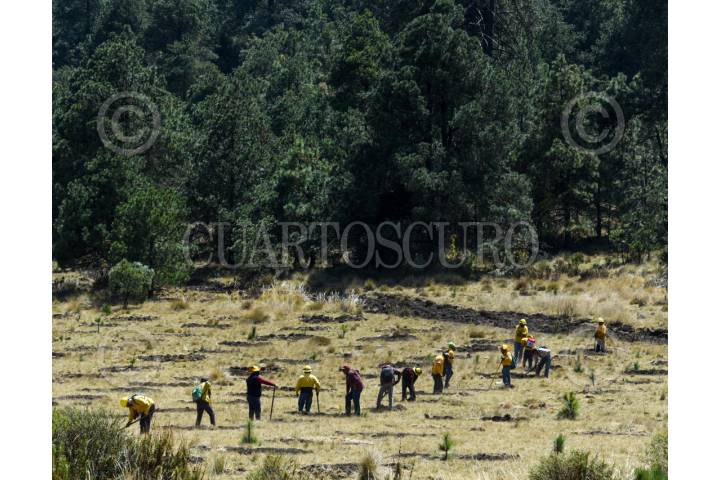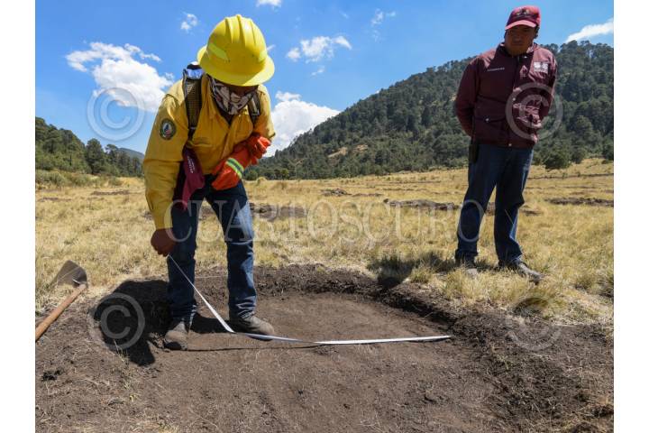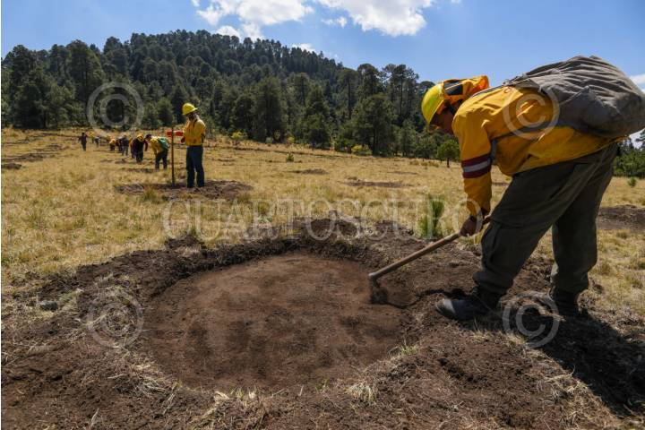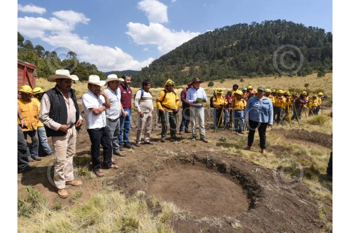 OCOYOACAC, ESTADO DE MÉXICO, 13MARZO2024.- Ante la problemática de escasea de agua en la CDMX y el Valle de México La ONG Nación Verde de manera conjunta con la Brigada Forestal de San Pedro Atlapulco, Ocoyoacac y con el apoyo de Jugos del Valle han desarrollado el Proyecto “Tláloc” Infiltración asistida de agua de lluvia, el cual consiste en la construcción terrazas subsoleo, zanjas de infiltración, cuencas de captación de agua y la revegetacion de suelos para aumentar la infiltración y recarga de mantos acuiferos, serán construidas 20,450 terrazas individuales las cuales captarán y filtrarán 6,155,450 litros de agua por lluvia en esta zona, en un área de 50 hectáreas. Con este proyecto se pretende tener un suelo forestal bien estructurado para aumentar la infiltración, disminuir escorrentia y mejorar la cobertura forestal de la zona. Pretenden replicar este proyecto en todo el país y buscan el empoderamiento de las comunidades indígenas que participan, ya que ellos estarán siendo empleados para realizar estas labores. FOTO: CRISANTA ESPINOSA AGUILAR /CUARTOSCURO.COM